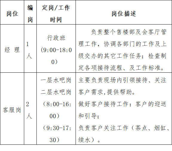 注:1、會客廳開放時間暫擬定為8:30-18:00。人員分早晚班制,保證開放時間的服務需求以提高服務質量。